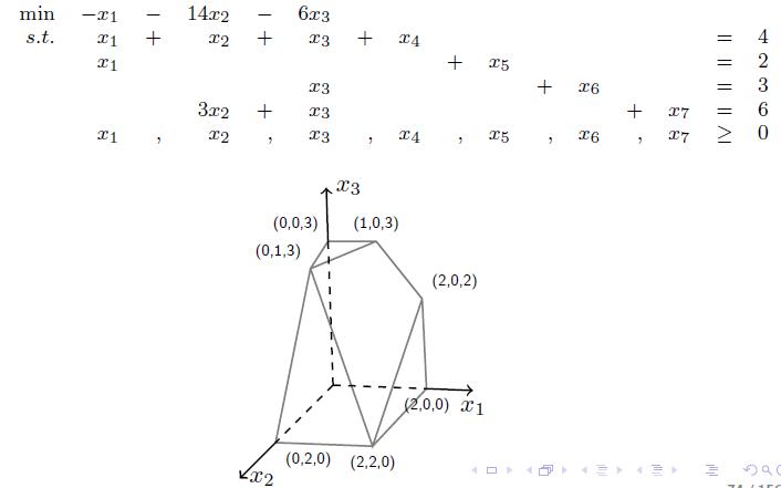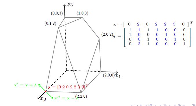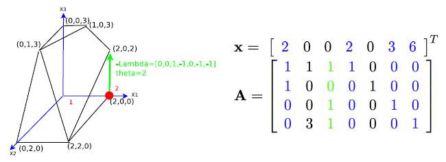 这个例子是松弛型约束的线性规划,原来的变量有三个分别是x123,加上后面四个变成标准型等式,形成的可行域如上图所示。现在取顶点$(0,2,0)$分析。(在实际问题中,也许没有办法获得起始顶点,这时候要采用大M算法或者两阶段单纯型算法,目前在计算机计算的大规模线性规划问题中,一般使用两阶段单纯型算法)将顶点带入约束中,可以计算得到一个完整解$x=(0,2,0,2,2,3,0)$。取出矩阵A中对应的x不为0的列,即下图中表蓝的几列(用$\mathbf{a}_2, \mathbf{a}_4, \mathbf{a}_5, \mathbf{a}_6$表示),那么这几列就是线性无关的,考虑$m<n$(约束的条件数小于松弛后的变量个数),那么自由解有$n-m$维,因此挑出来的列必有$m$个,构成一组基底。