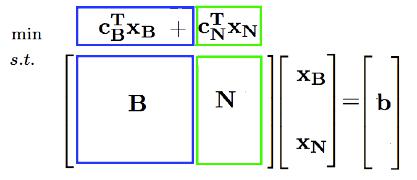 在这里,我们还可以对每一组解,都将$\mathbf{A}$的列重新排列一下,将解向量也排列一下,写成分块矩阵的形式,因为重新排列之后形成的$\mathbf{x}_N = 0$ ,那么就会有$\mathbf{x}_{\mathbf{B}}=\mathbf{B}^{-1}\mathbf{b}$,并且目标函数转化为$\mathbf{c^Tx=c_B^TB^{-1}b}$。这是两个很有用的公式,在后面的单纯型算法的理解上很有帮助。