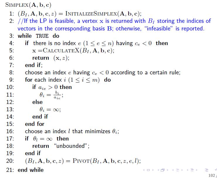 单纯型算法呼之欲出。将上面的东西整理整一个简短的高效的可行算法并不简单。伪代码如下: