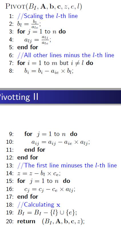 - 一行一行地看PIVOT算法。输入参数告诉我们下标为$l$的向量被换出,因此找到他对应的那行,暂称为第$l$行,这一行对应的基的下标要被换成$e$,那么为什么更新后对应的解是$\frac{b_l}{a_{le}}$呢,要注意,其实这个值就是$\theta$,$b_l$就是旧的$x_i$,$a_{le}$就是$\lambda_i$(上面已经解释了乘上$\mathbf{B}^{-1}$后每一列都是系数)。那么为什么更新后是$\theta$呢?我们回到式子$\mathbf{x’=x-\theta\lambda}$,由于$b_l$现在对应的新向量不是$\mathbf{x}$对应的基向量,因此$\mathbf{x}$在该位置的值是0,而我们知道$\lambda$在入基向量对应的位置的值是-1,因此$0-(-1)\theta=\theta$。