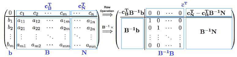 - 最关键最有意思的就是PIVOT算法,他巧妙地将我们介绍的繁杂操作使用一个简单的高斯行变换就实现了。而这个算法的载体就是单纯形表,如上图,左上角是目标函数值相反数$-z$,第一行是检验数$\bar{\mathbf{c}}$,左下角是基对应的部分解(其他部分是0,不用写出),右下角是矩阵$\mathbf{A}$。他始终被分块成两部分,基向量部分始终以单位阵的形式存在。注意左边的部分解每个分量都是严格对应着一个基向量,即他们是有顺序的。